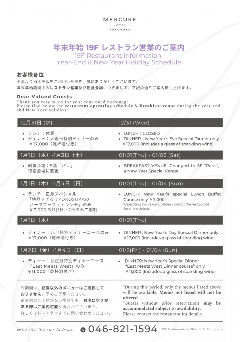 年末年始期間中の19Fレストラン営業及び朝食会場につきまして、下記の通りご案内申し上げます。